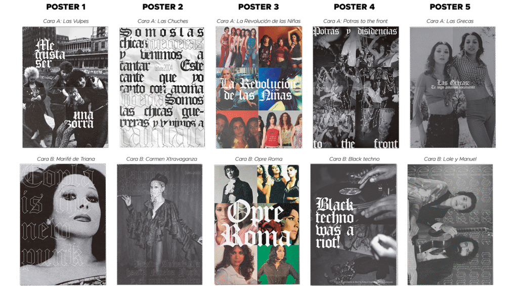 5 pósters por ambas caras, A3 y doblados estilo súper pop, un homenaje a las niñas que revolucionaron la música de nuestra adolescencia, la copla, el punk, el flamenco y todas esas genealogías que nos sostienen.